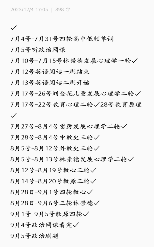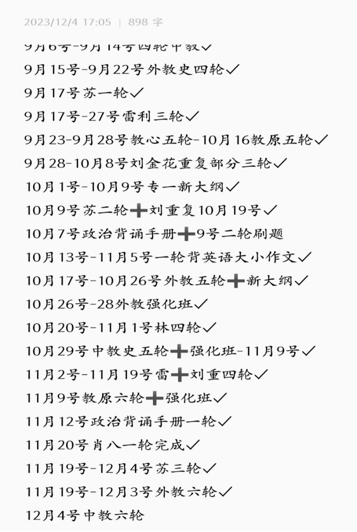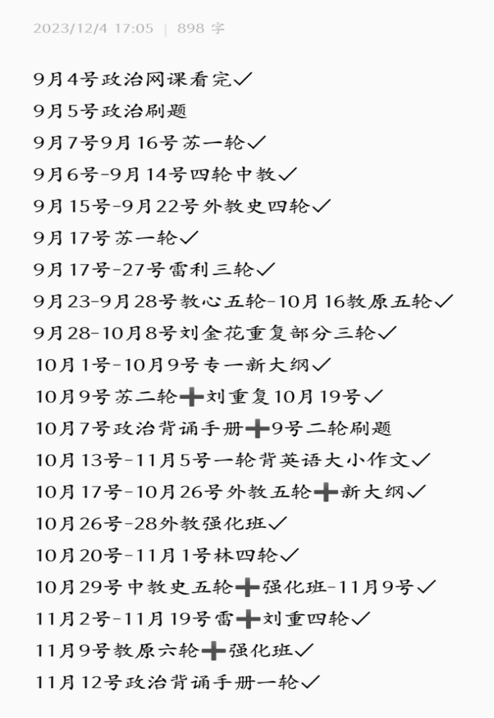 政治我是到9月份才开始听徐涛老师的强化班,做相应的1000题,等肖四肖八出了之后就是疯狂刷题,疯狂背题。政治花的时间很少,但是回报高。因为政治最后的资料出的比较晚,所以前期要把英语和专业课打好基础,最后一个月留给政治。