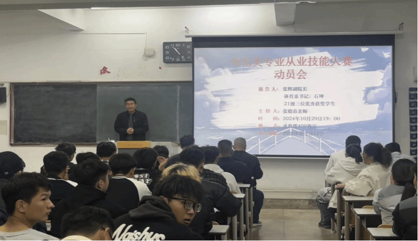 2024年10月29日晚上7点,张辉副院长、石坤老师、马培兵老师以及班主任张晓春老师、董红梅老师、刘国聪老师、李延军老师及21体教3名获奖学生参加此次动员会,体育学院的领导及教师们,在繁忙的工作之余,莅临409教室,为22级体育教育专业的全体学生举行了师范类专业从业技能校级选拔赛的动员大会。